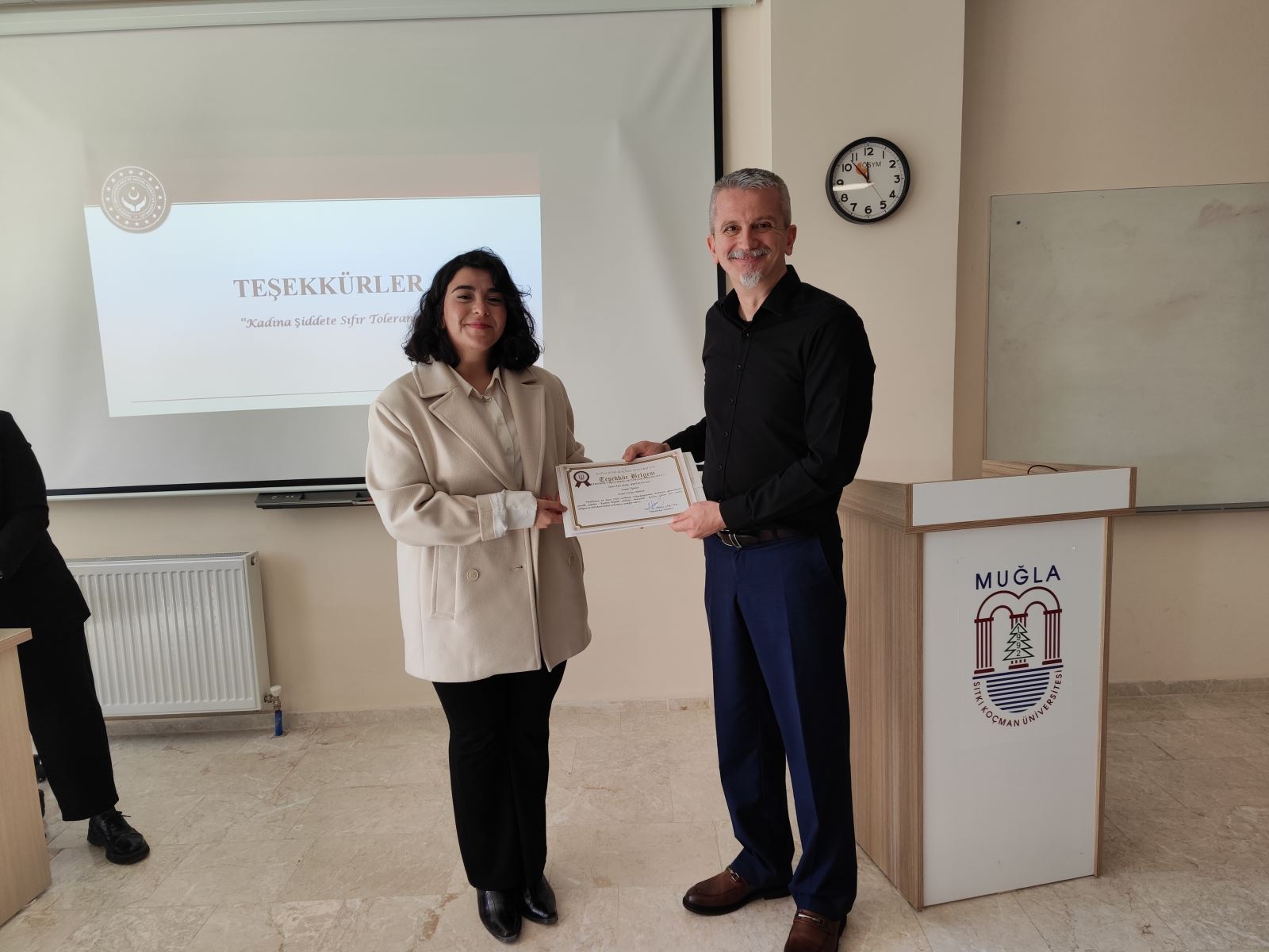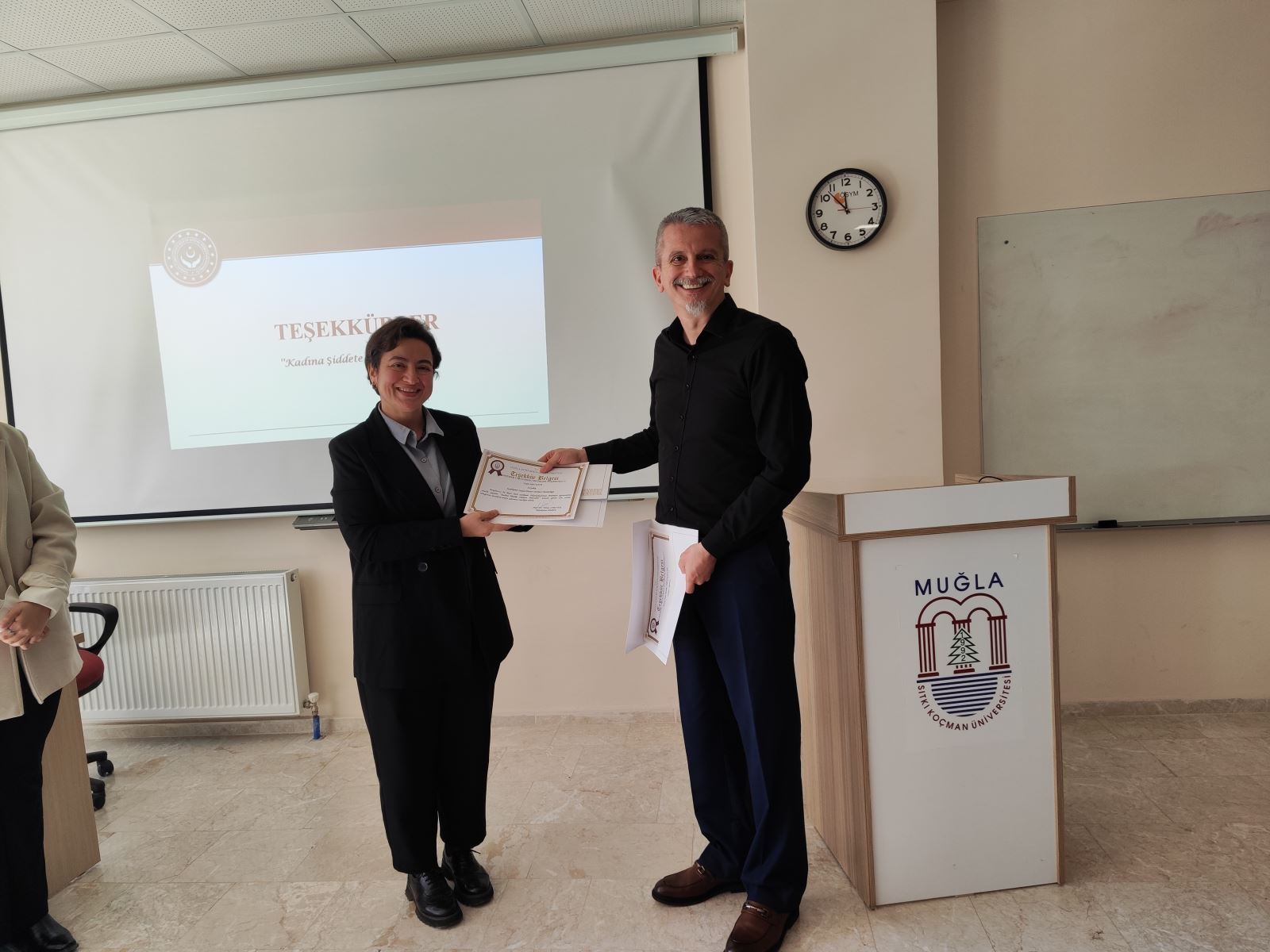 Etkinlik sonunda, Sosyal Hizmet Bölüm Başkanı Sayın Doç. Dr. Bülent ÖNGÖREN tarafından verdikleri desteklerden dolayı Sosyolog Sibel KAYA ve Stajyer Öğrenci Ayşe Melek ARTUKARSLAN'a Teşekkür Belgesi takdim edilmiştir.
